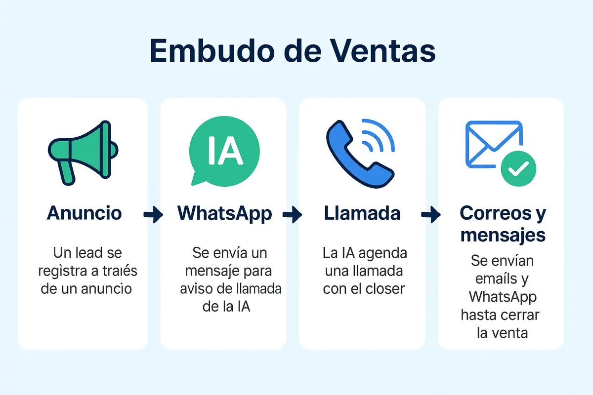 Perfecto. Este sistema no reemplaza a tu equipo: lo potencia. Tu equipo se enfoca solo en leads listos para comprar, mientras la IA y las automatizaciones hacen el trabajo de cualificación, seguimiento y activación emocional.